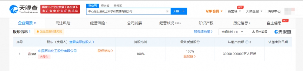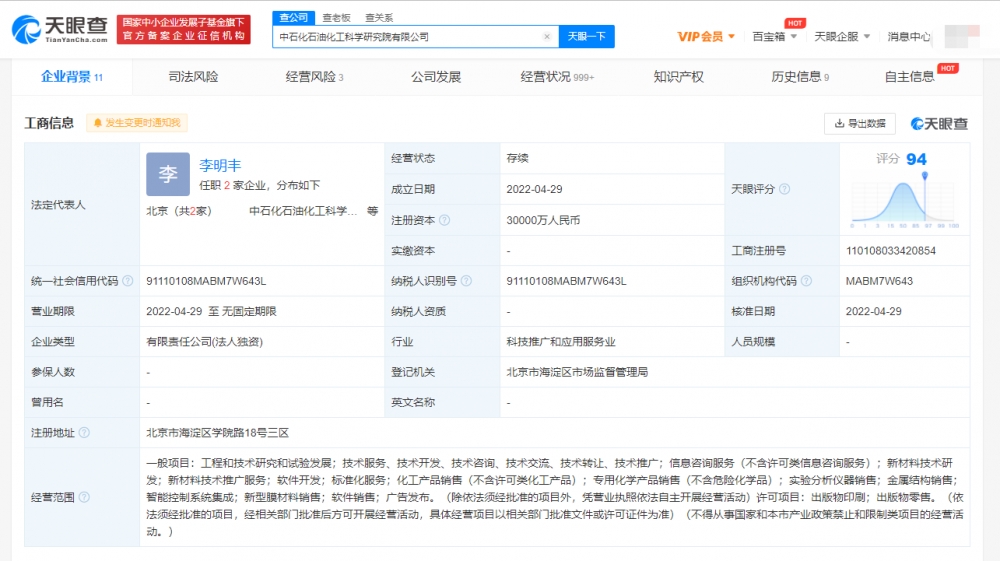 近日,中石化石油化工科学研究院有限公司成立,法定代表人为李明丰,注册资本3亿人民币,经营范围包括工程和技术研究和试验发展;新材料技术研发、推广服务;化工产品销售等。股东信息显示,该公司由中国石油化工股份有限公司全资控股。