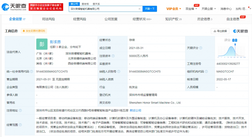 近日,深圳荣耀智能机器有限公司发生工商变更,注册资本由1亿人民币增至5亿人民币,经营范围新增机械设备租赁。该公司成立于2021年5月,法定代表人彭求恩,由荣耀终端有限公司全资控股。