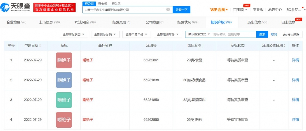 近日,内蒙古伊利实业集团股份有限公司申请注册多枚“嚼绝子”商标,国际分类包括方便食品、啤酒饮料、医药等,当前商标状态为等待实质审查。